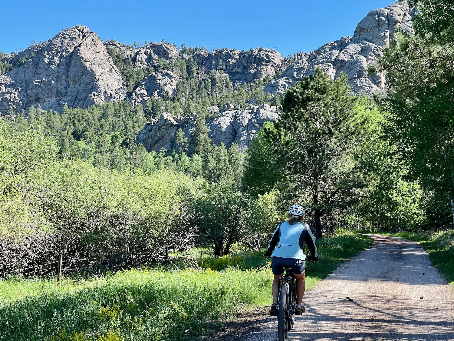 Gliding past the big mountains on a gently-graded trail. The views along the Mickelson Trail are gorgeous. South Dakota, USA. Copyright © 2019-2021 Pedals and Puffins.