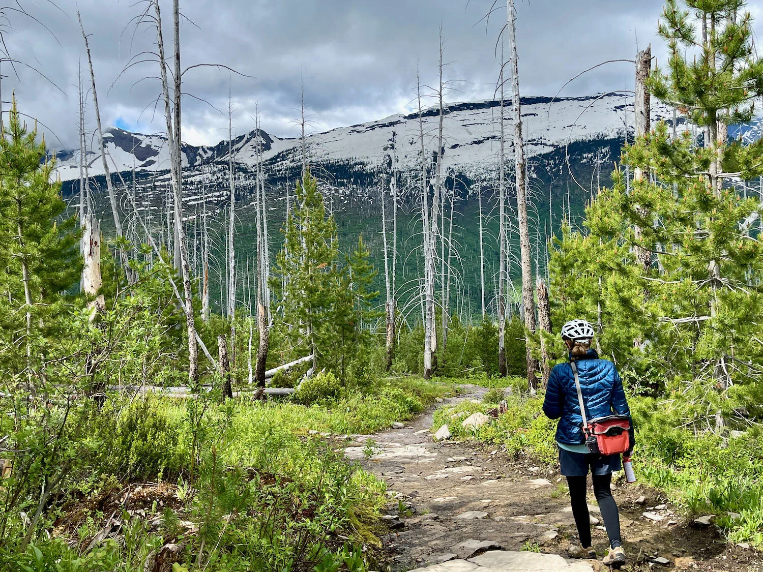Young conifers line The Loop Trail, growing among the whitening snags of older trees killed in a forest fire. Glacier National Park, Montana, USA. Copyright © 2019-2021 Pedals and Puffins.